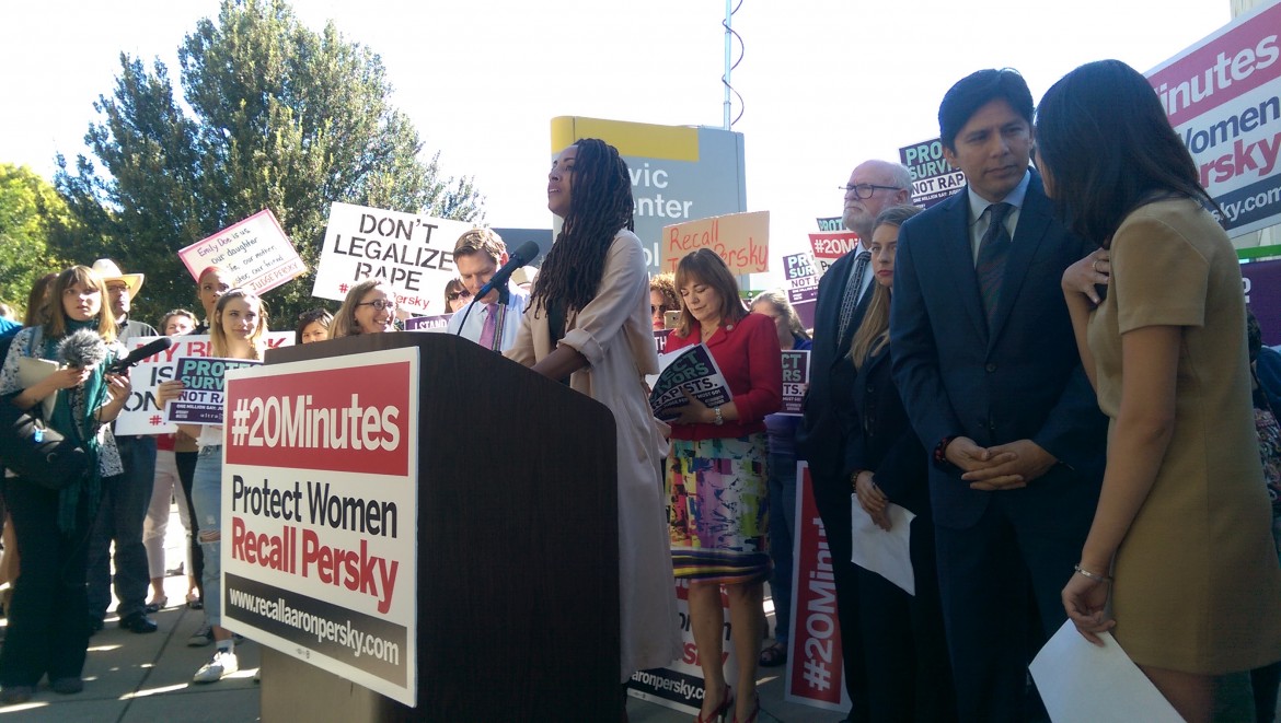 Leading up to the rally, he called on Gov. Jerry Brown to sign legislation that would require mandatory prison time for sexually assaulting an unconscious person. In California, using force in sexual assault already requires a prison sentence, but not in cases where the victim is incapacitated and no force is used.