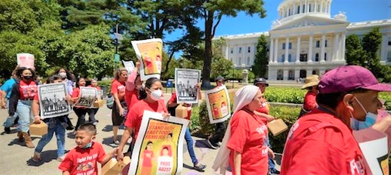 Donning red T-shirts from the decade-old “Fight for $15” minimum wage campaign, the workers chanted for the passage of Assembly Bill 257.