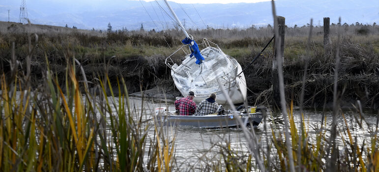 Small motorboats and sailboats can be seen traversing the Alviso Slough, while others have been abandoned. Photo by Greg Ramar