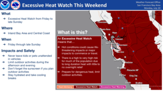 Temperatures are expected to peak starting Friday, with moderate to major heat risk for much of the Bay Area, North Bay and Central Coast. With low relative humidity, this weekend's dry heat also brings an elevated danger of fires inland, the NWS warns.