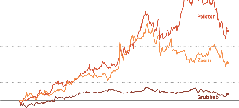 Despite the recent decline, the same is true for companies whose products and services were suddenly in great demand for video conferencing (like Zoom), home exercising (Peloton) and takeout meal delivery (Grubhub and DoorDash). Zoom shares have tripled in the past year, while Peloton is up fivefold.