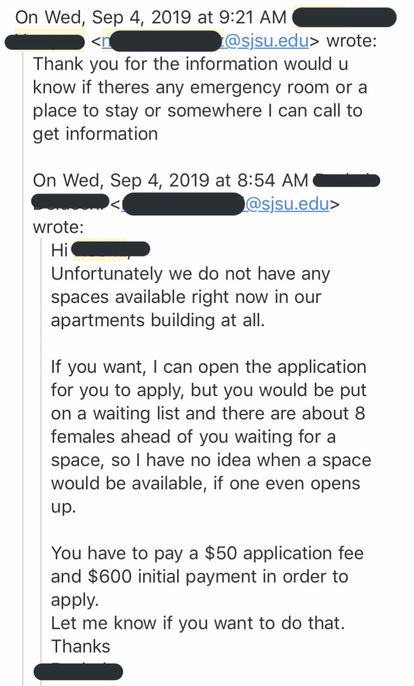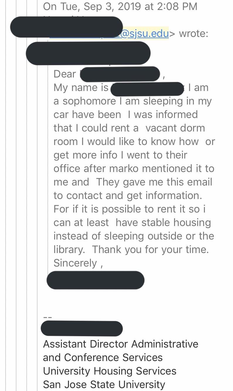 “I was informed that I could rent a vacant dorm room,” the student, who asked to remain anonymous for this story, wrote in an email to SJSU’s Housing Services on Sept. 3.“They gave me this email to contact and get information. [Is] it possible to rent it so I can at least have stable housing instead of sleeping outside or [in] the library?”