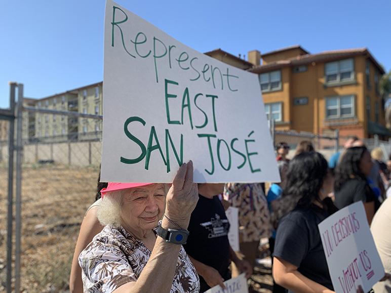 Carrasco, surrounded by D5 residents and activists from community advocacy nonprofit SOMOS Mayfair, stood in front of an empty lot on Alum Rock Avenue. They held up signs reading “desarollo sin desplasaminento” and “no more politics as usual.” They chanted and spoke about displacement and gentrification plaguing the largely Latino East Side.