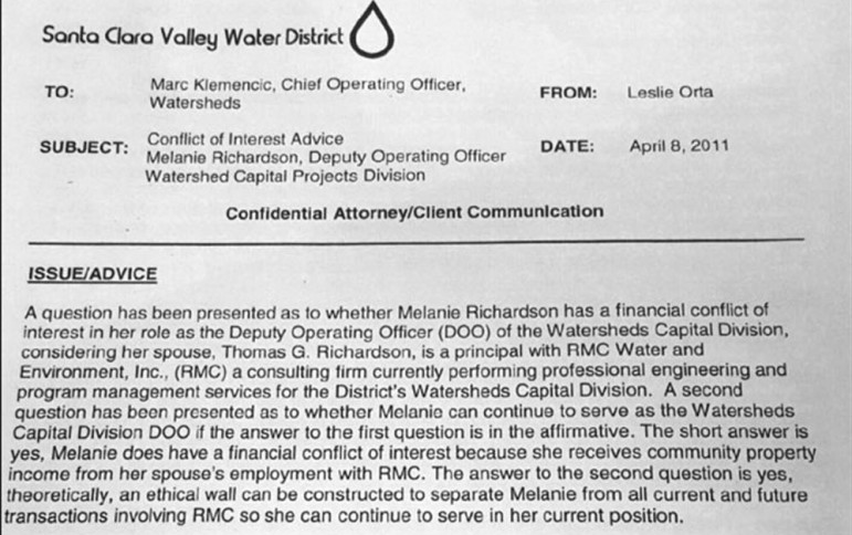 One recently discovered document from April 2011, written by senior district counsel Leslie Orta, states that Melanie Richardson had a clear conflict of interest related to RMC while overseeing procurement for the district. It also states that she would continue to have a conflict of interest in her role in charge of watershed projects unless an ethical wall was created. As of last year, Melanie Richardson was still providing performance evaluations for district staff working on RMC projects.