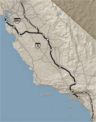 The California bullet train’s route from Los Angeles to San Francisco, traversing the state’s mountain ranges and its Central Valley, is shown in a dark black line. The route was selected over proposals that would have roughly followed the I-5 and the I-580 highways between Southern and Northern California. The light gray line shows a proposed second phase that would extend the system to San Diego and Sacramento, though it has not received environmental approvals or funding.