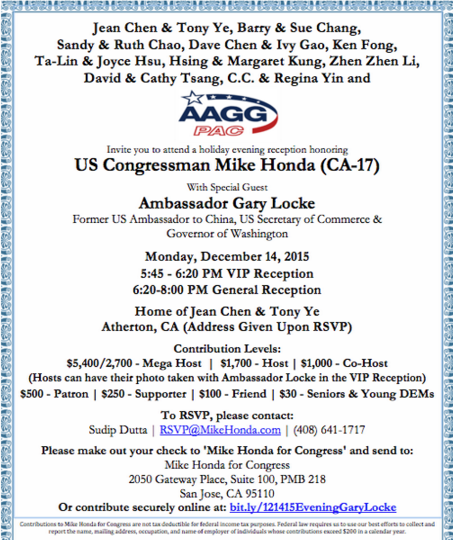 Honda has mostly refrained from commenting on his “Cranes” list and the House Committee on Ethics investigation, but on Monday he attended two fundraisers co-hosted in Silicon Valley by “Cranes” Ta-Lin and Joyce Hsu, and C.C. and Regina Yin. The events sold a variety of contribution levels and teased access to Gary Locke, the former U.S. Ambassador to China.