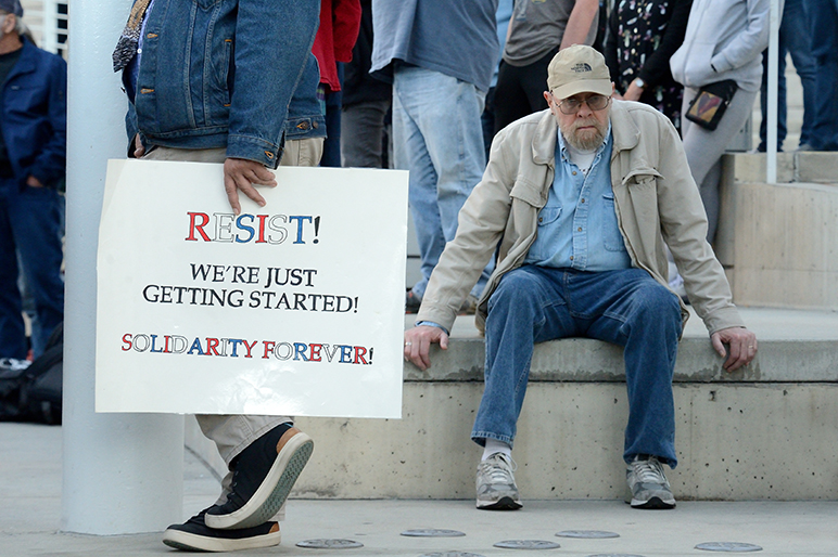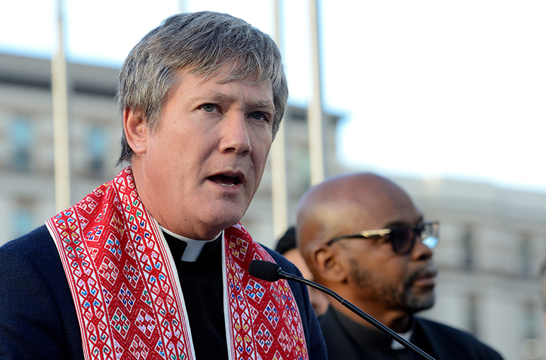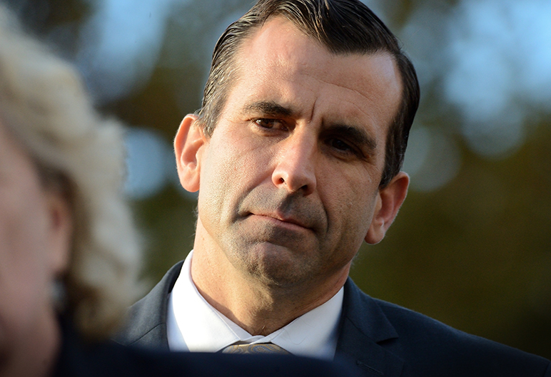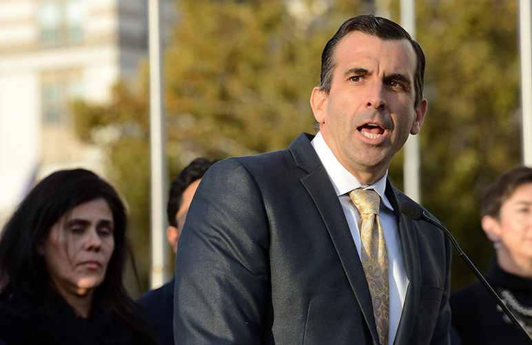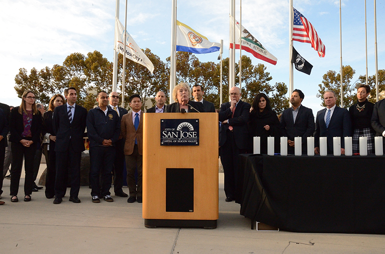 - San Jose Mayor Sam Liccardo addresses the crowd Tuesday.