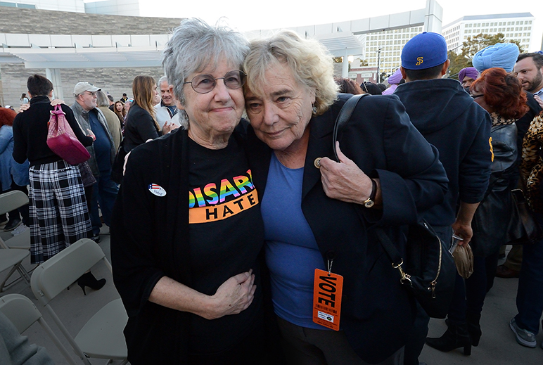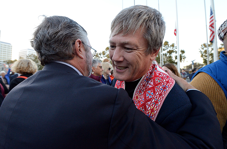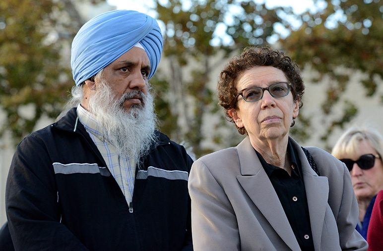 - Congresswoman Zoe Lofgren (D-San Jose) embraces another vigil attendee.