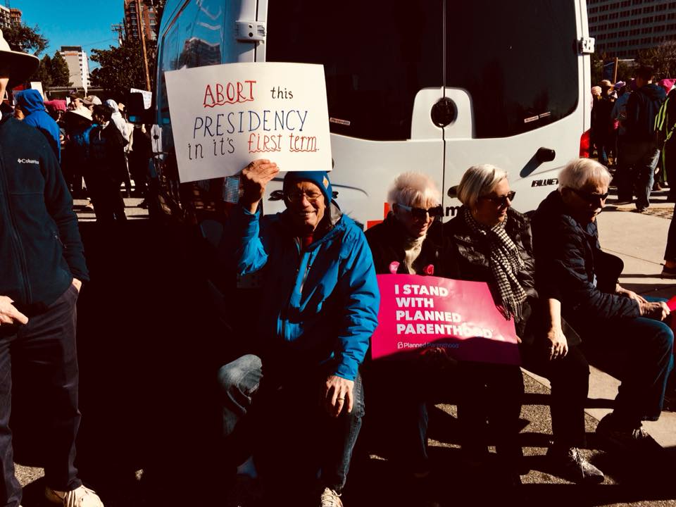 People carried signs condemning President Trump and sexual violence and advocated for women’s equality and reproductive rights in a demonstration that kicked off at City Hall and ended at the Arena Green by Little Italy.
