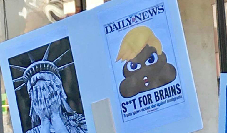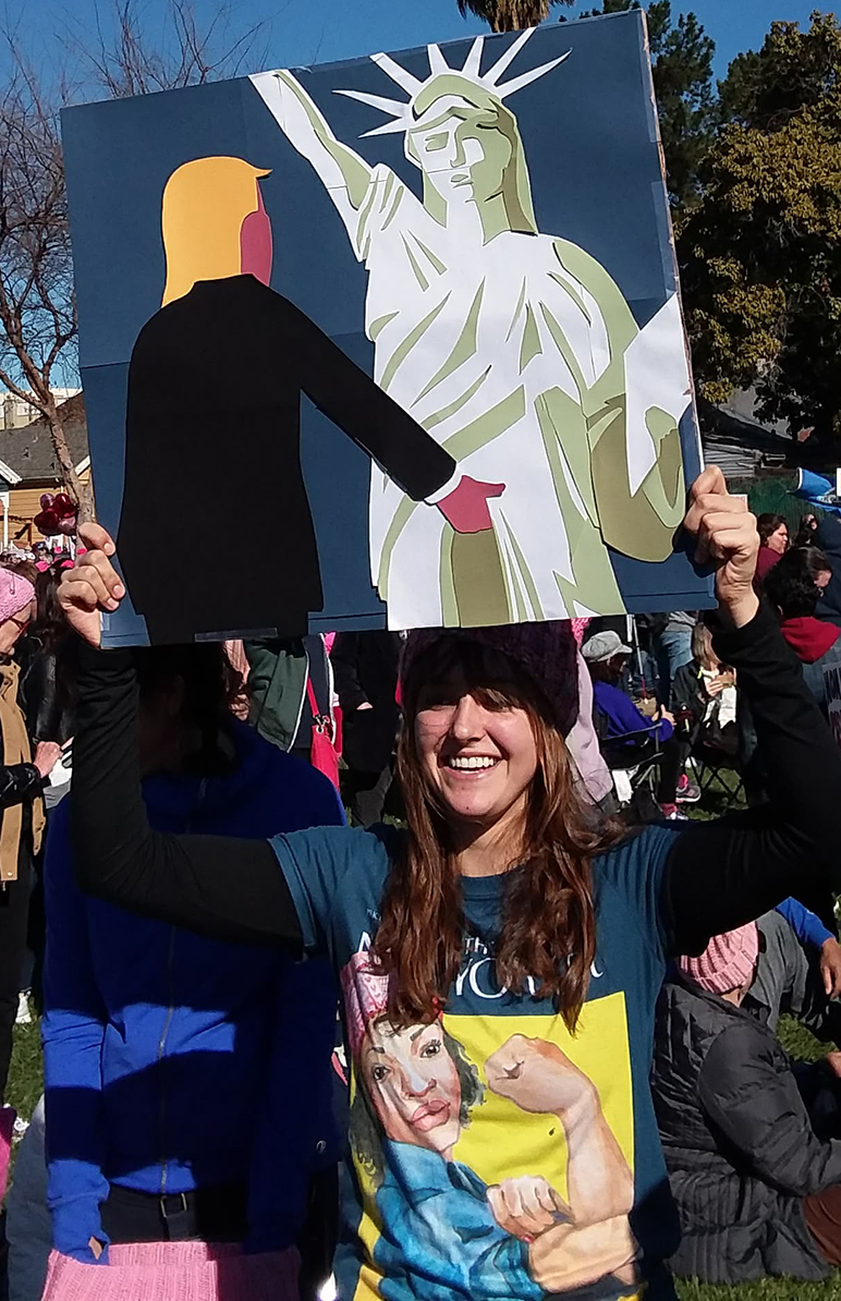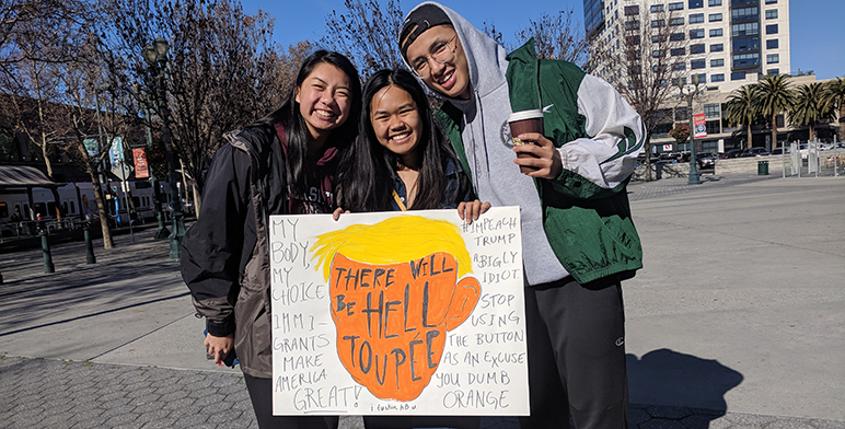 “This isn’t just about how much I hate Donald Trump,” said Evergreen Valley High senior Katie Tran, who held a poster with an orange effigy of the president’s face emblazoned with the warning, “There will be hell toupée.” “But he represents everything that I don’t. How can I support someone who doesn’t support me and everything I stand for?”