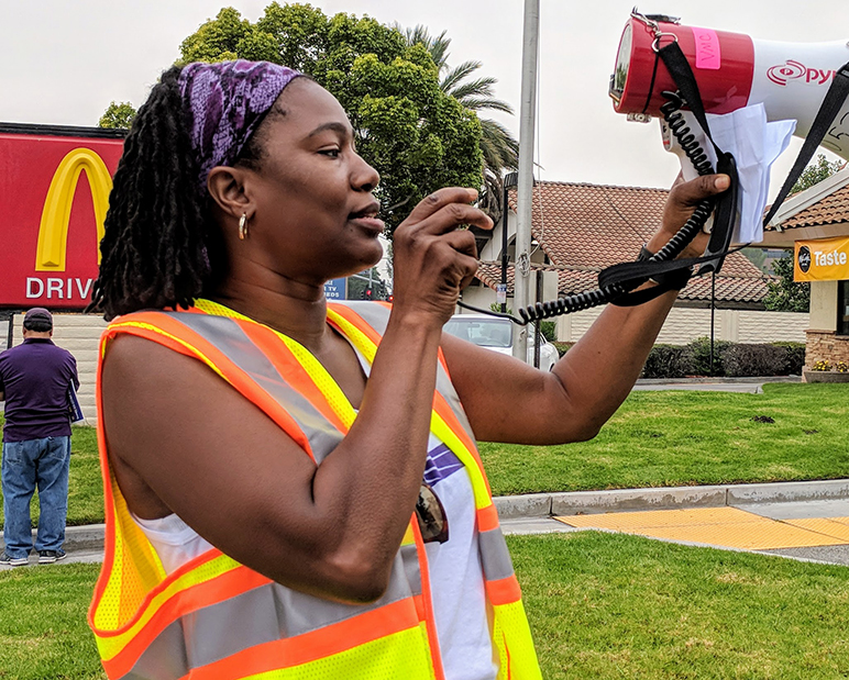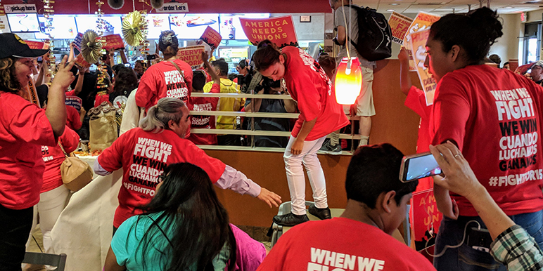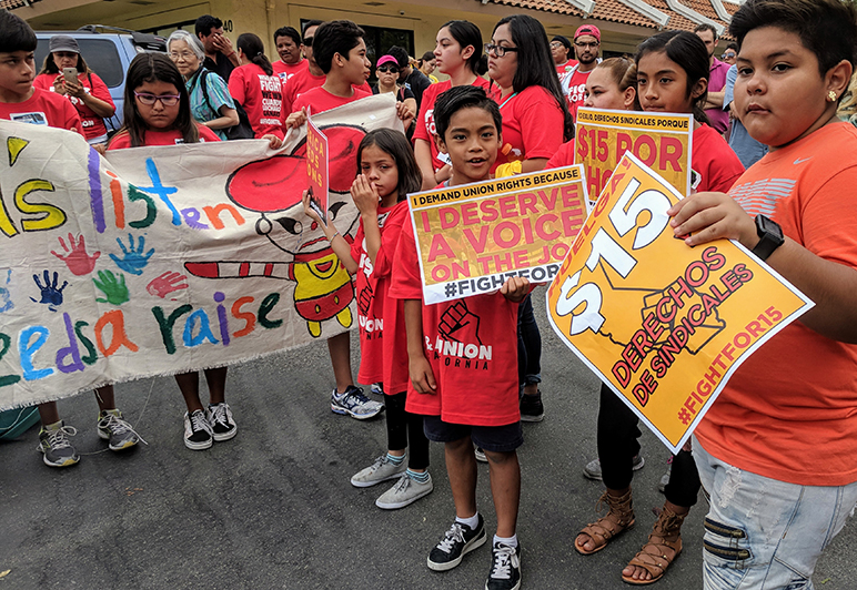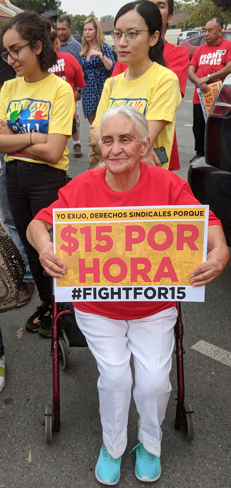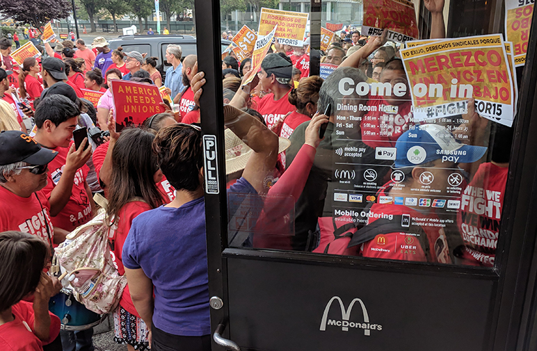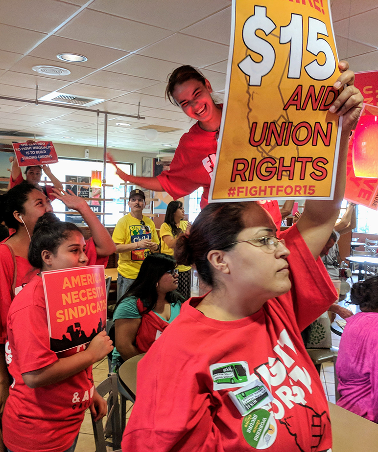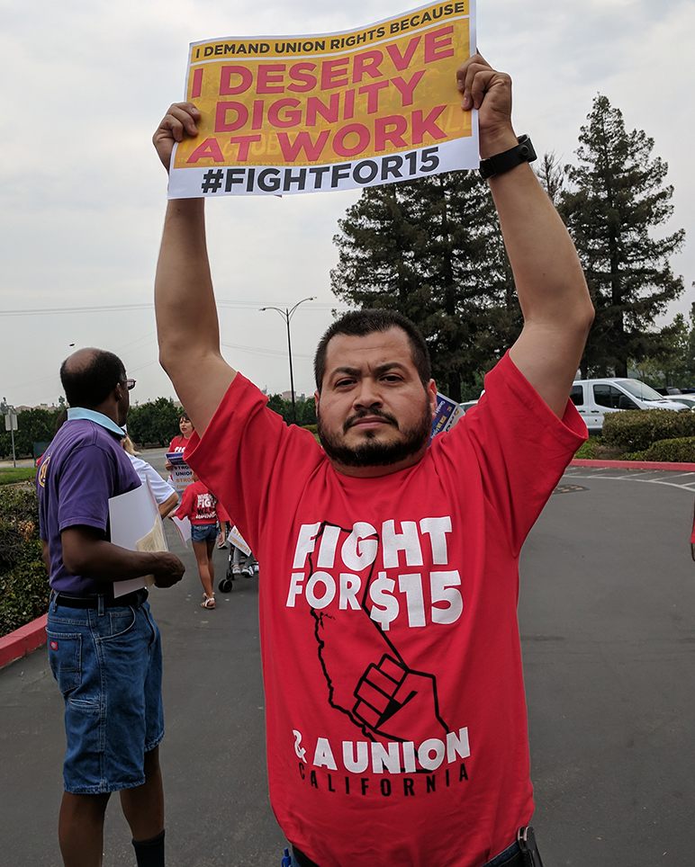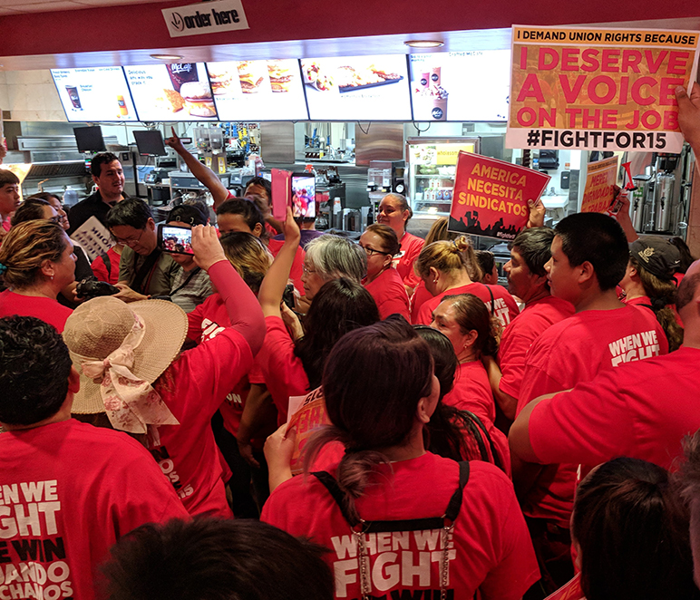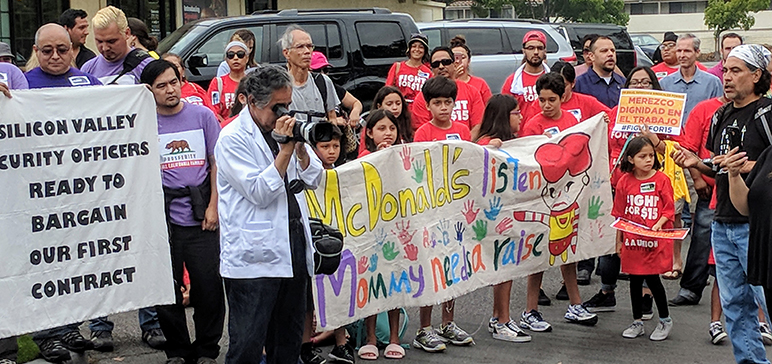 SEIU Local 521 organized the local rallies, driving a few hundred people by school buses first to McDonald’s on North First Street in San Jose, where protesters marched through the restaurant with drums and a bullhorn to demand a $15 minimum wage.