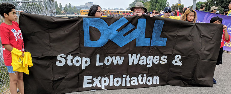 Protesters then bused to Dell’s offices in Santa Clara, where they called out the corporation for terminating janitors after they unionized last year and replacing them with cheaper part-time workers.