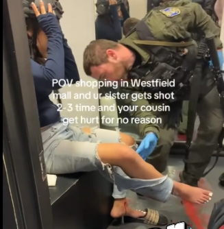 Police tend to an injured shopper at Valley Fair Mall, scene of a Black Friday shooting. Screen capture of East Side San Jose Times video posted on Facebook.