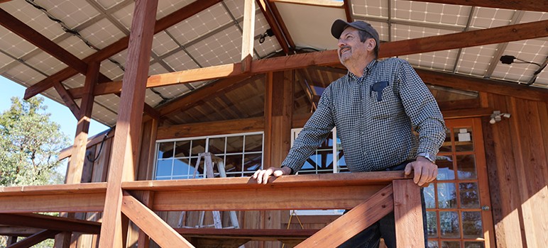 Sixteen solar panels cover the patio, far more than needed to power the home, and a sheet metal roof shelters the rest of the house. Inside, a wood-burning stove fashioned from an old water tank stands in one corner, a kitchen fills up the other, a cupboard and, overhead, a sleeping loft. The only separate room in the house is the full bathroom, with a bathtub and toilet that drains into a 1,500-gallon septic tank with a proper leach field. In all: $5,000 to build, about another $6,000 for the solar panels.