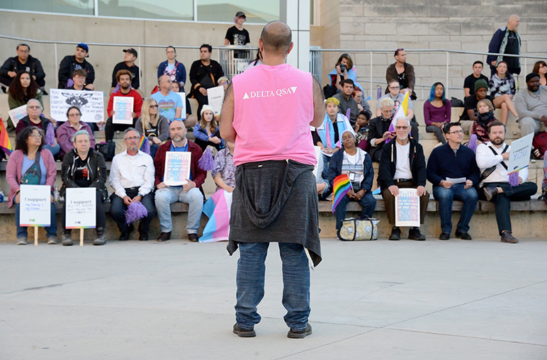 “Whatever policy is written, whatever somebody wants to say, we’re here,” Anthony Ross, head of transgender services for Santa Clara County’s Office of LGBTQ Affairs, told the crowd outside the City Hall rotunda. “We’re not going anywhere, and I love that about this community. We are resilient.”