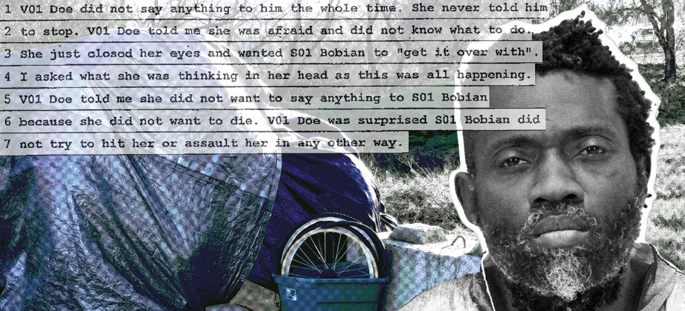How she ducked into the shelter fashioned from tarps and shopping carts to deliver several bags of groceries and Chinese takeout, just as she said she would in a text to her newlywed spouse earlier that evening. How, before she could leave the cramped quarters, she says the man—with “a crazy look in his eyes”—somehow boxed her inside, told her she was “pretty” and “sexy” and that he wanted to “f---k” her.
