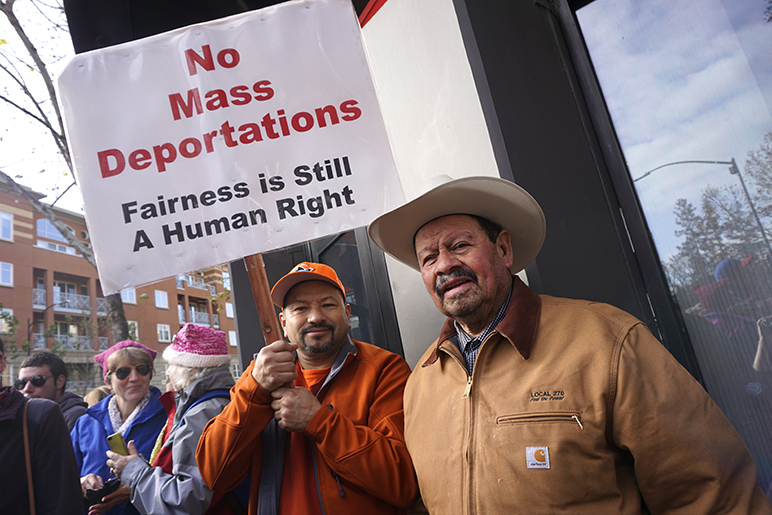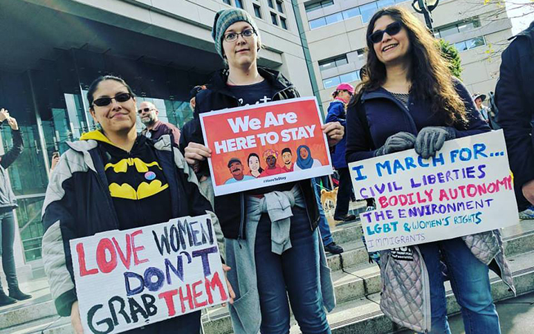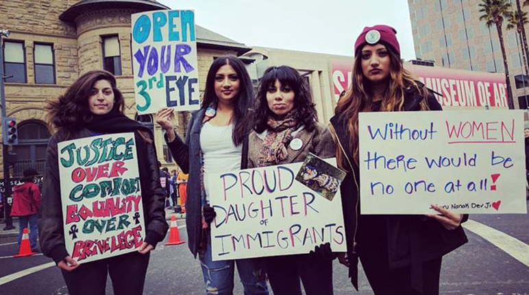 - Daughters of immigrants marching for their families. Saya (left), who’s from Iraq, says one of her uncles was killed during the conflict in Syria. Mandee Banga (second from left) and sister Saranjit Banga (right) said their father wears a turban and they fear for his safety under a president who incites violence and xenophobia. Tina, a teacher at a school in Gilroy, says the migrant worker families she works with have been plagued by a rash of suicides because of their despair over Trump’s election.