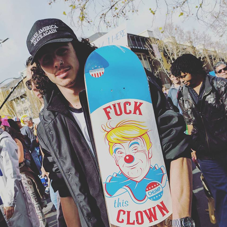- Christopher “Make America Skate Again” Rodriguez on the inauguration: “I couldn’t watch it. I didn’t think it would come to this point. I didn’t think he’d make it.” And what brings him out to the march? “I’m here for my grandma and what she represents, women’s rights, healthcare, all that stuff.”