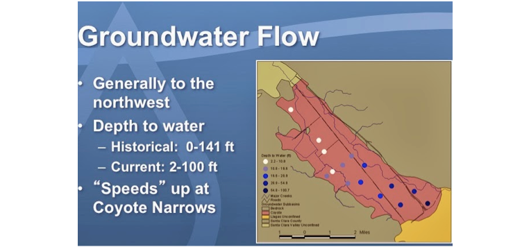Further south, however, the high porosity of these gravel-filled deposits makes our aquifer extremely vulnerable to contamination from any pollutants that are discharged onto the land or into Coyote and Fisher Creeks that traverse the 10-mile length of the Coyote Valley. Once they reach the usually high groundwater table of the Coyote Valley, pollutants can move quickly down gradient (north) toward the thousands of private and municipal wells serving nearly 2 million people.