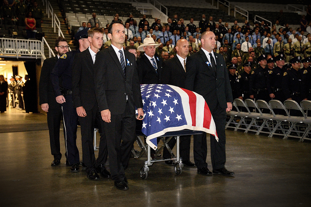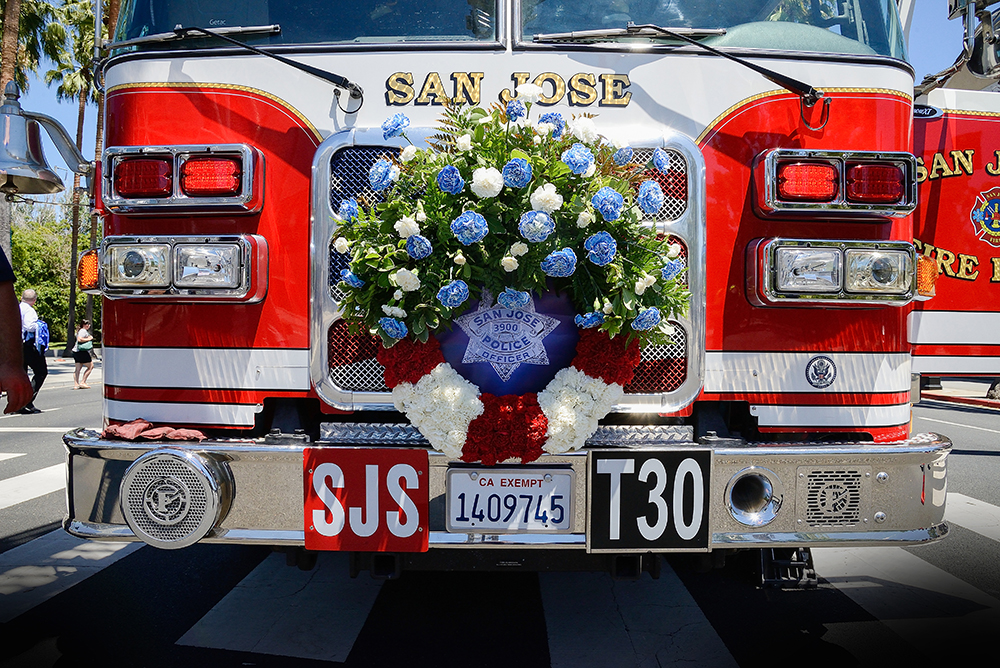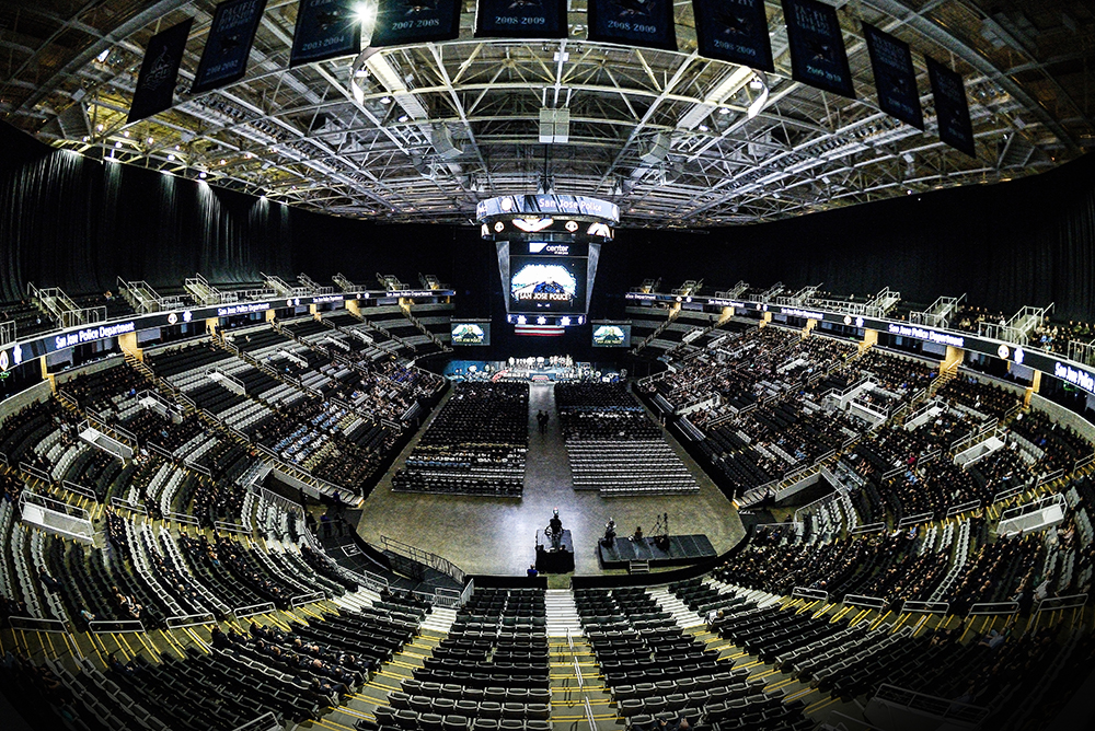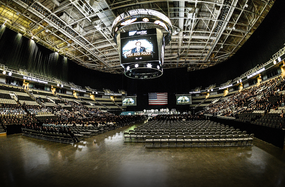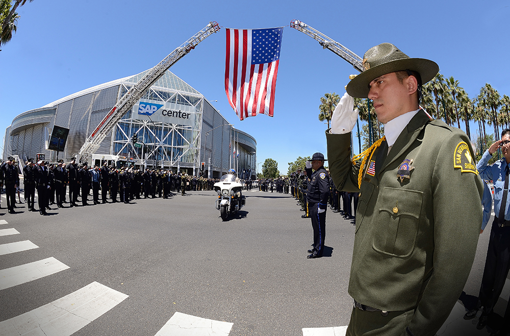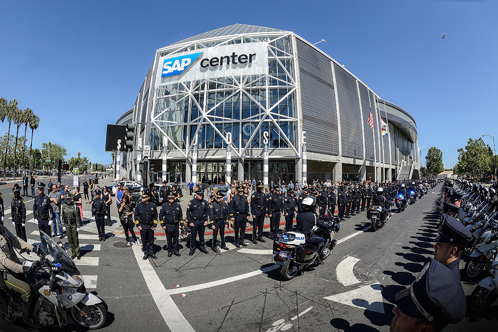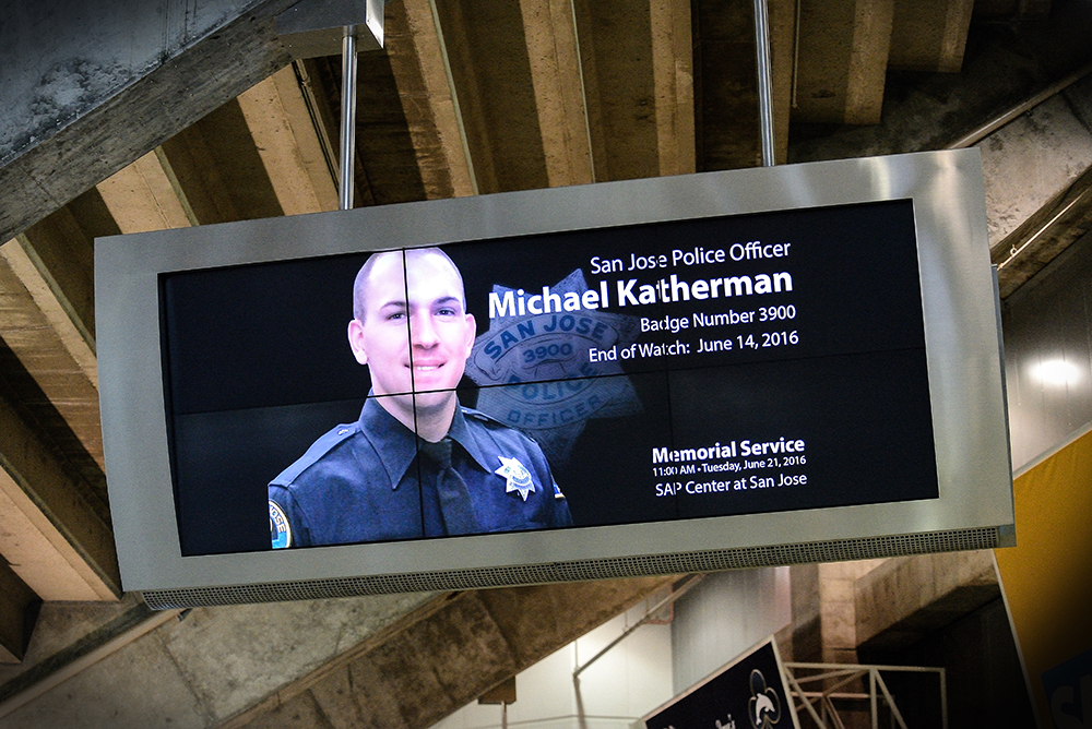 San Jose’s top cop also happens to be its most eloquent speaker. So on Tuesday, Chief Eddie Garcia eulogized Officer Michael Katherman, who became the city’s 13th line-of-duty casualty after a June 14 traffic collision. “Mike was an exceptional cop, but an even better man,” Garcia said. State Attorney General Kamala Harris joined hundreds of police officers from across the Bay Area at SAP Center to pay respects to Katherman—a motorcycle officer, 11-year department veteran, husband and father of two school-aged sons, Josh and Jason. Notably absent from the event, at the family’s behest, was most of the City Council and the mayor himself, Sam Liccardo. Councilman Ash Kalra attended the event with colleague Raul Peralez, who served alongside Katherman before getting voted onto the council. Spelled in blue-and-white flowers onstage and emblazoned on black bands worn by fellow officers was his badge number: 3900. A tearful Michael Whittington, who went from being Katherman’s academy-mate to beat partner before moving on to the county District Attorney’s Office, said his fallen friend was “built for power.” Kat Man, as his buddies called him, often surprised people. At just 5-foot-8, he could dunk a basketball. He jogged slow but sprinted fast. Kat Man hauling ass during the 100-yard dummy drag, Whittington quipped, was “like watching a bear carry a kitten.” Katherman, his smile “big as a grand piano,” entertained friends with impersonations of Chris Farley, Kermit the Frog and a retired SJPD sergeant. As a vice, he preferred ice cream over beer. When the chief looked through Katherman’s personnel file, two cases stood out. In one, a grandmother called his heart-to-heart talk with her wayward teen granddaughter “a life-changing event for the family.” In another, Christmas Eve 2011, he saved the life of a stabbing victim. “There is no such thing as routine patrol,” Garcia said before exhorting the auditorium to celebrate Katherman’s life as well as mourn the loss. “You raised an honorable, righteous and caring young man,” Garcia told the fallen officer’s parents, Tom and Diane Katherman. “Your mission is accomplished.”