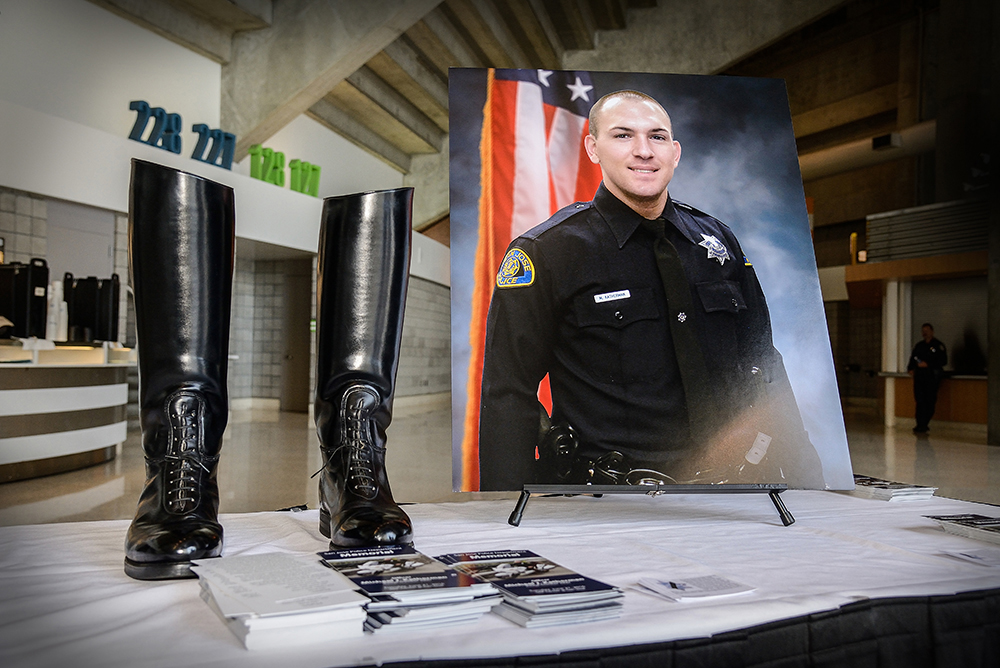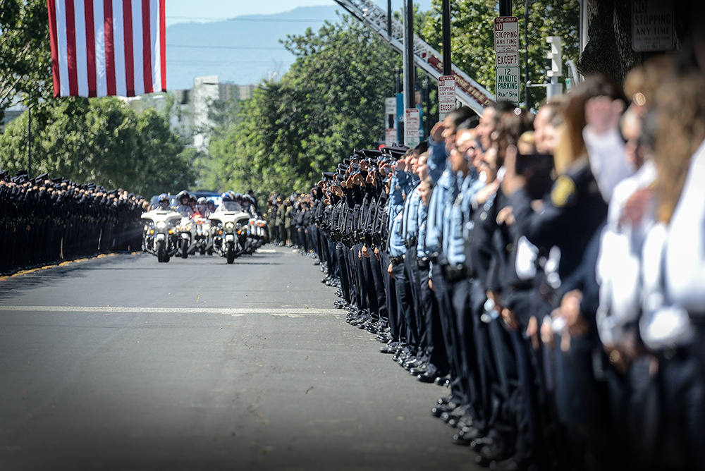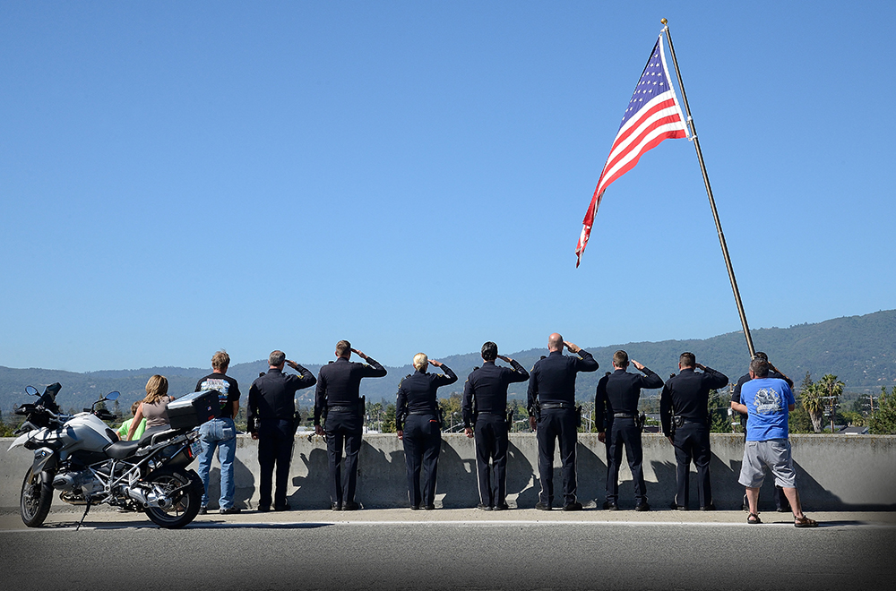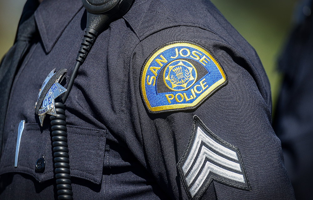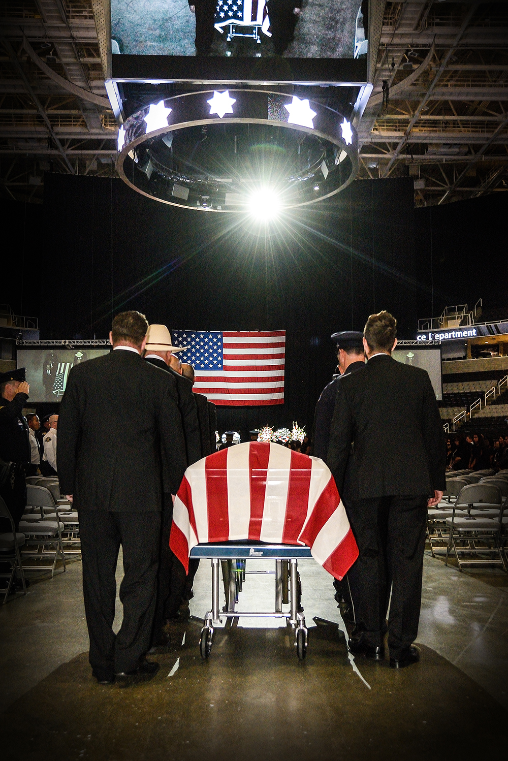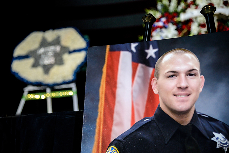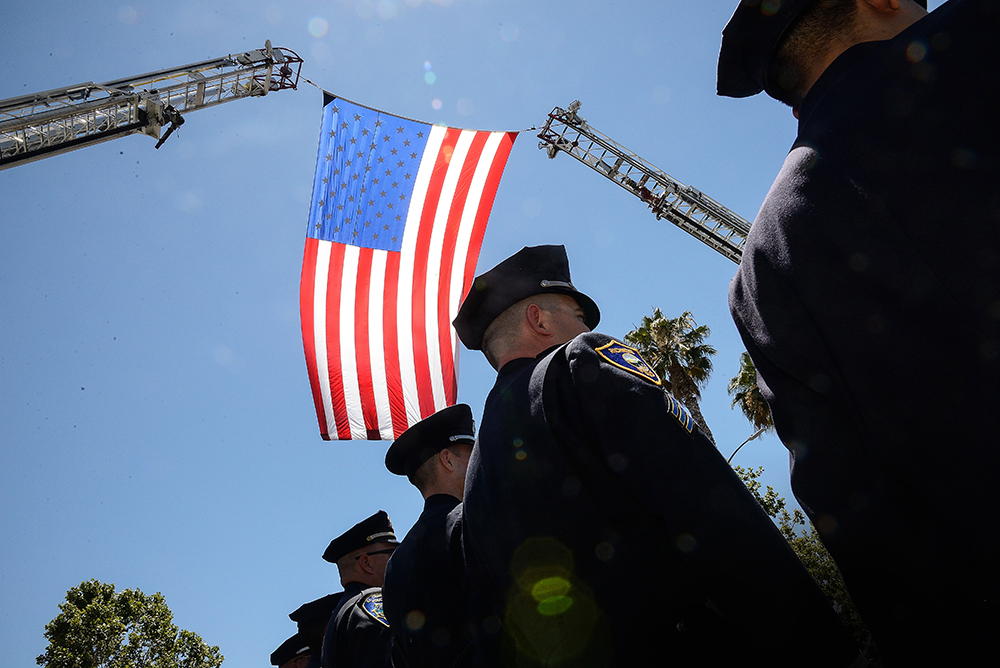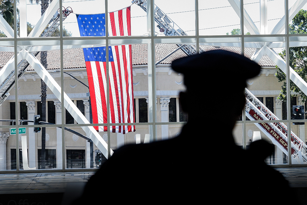 San Jose’s top cop also happens to be its most eloquent speaker. So on Tuesday, Chief Eddie Garcia eulogized Officer Michael Katherman, who became the city’s 13th line-of-duty casualty after a June 14 traffic collision. “Mike was an exceptional cop, but an even better man,” Garcia said. State Attorney General Kamala Harris joined hundreds of police officers from across the Bay Area at SAP Center to pay respects to Katherman—a motorcycle officer, 11-year department veteran, husband and father of two school-aged sons, Josh and Jason. Notably absent from the event, at the family’s behest, was most of the City Council and the mayor himself, Sam Liccardo. Councilman Ash Kalra attended the event with colleague Raul Peralez, who served alongside Katherman before getting voted onto the council. Spelled in blue-and-white flowers onstage and emblazoned on black bands worn by fellow officers was his badge number: 3900. A tearful Michael Whittington, who went from being Katherman’s academy-mate to beat partner before moving on to the county District Attorney’s Office, said his fallen friend was “built for power.” Kat Man, as his buddies called him, often surprised people. At just 5-foot-8, he could dunk a basketball. He jogged slow but sprinted fast. Kat Man hauling ass during the 100-yard dummy drag, Whittington quipped, was “like watching a bear carry a kitten.” Katherman, his smile “big as a grand piano,” entertained friends with impersonations of Chris Farley, Kermit the Frog and a retired SJPD sergeant. As a vice, he preferred ice cream over beer. When the chief looked through Katherman’s personnel file, two cases stood out. In one, a grandmother called his heart-to-heart talk with her wayward teen granddaughter “a life-changing event for the family.” In another, Christmas Eve 2011, he saved the life of a stabbing victim. “There is no such thing as routine patrol,” Garcia said before exhorting the auditorium to celebrate Katherman’s life as well as mourn the loss. “You raised an honorable, righteous and caring young man,” Garcia told the fallen officer’s parents, Tom and Diane Katherman. “Your mission is accomplished.”