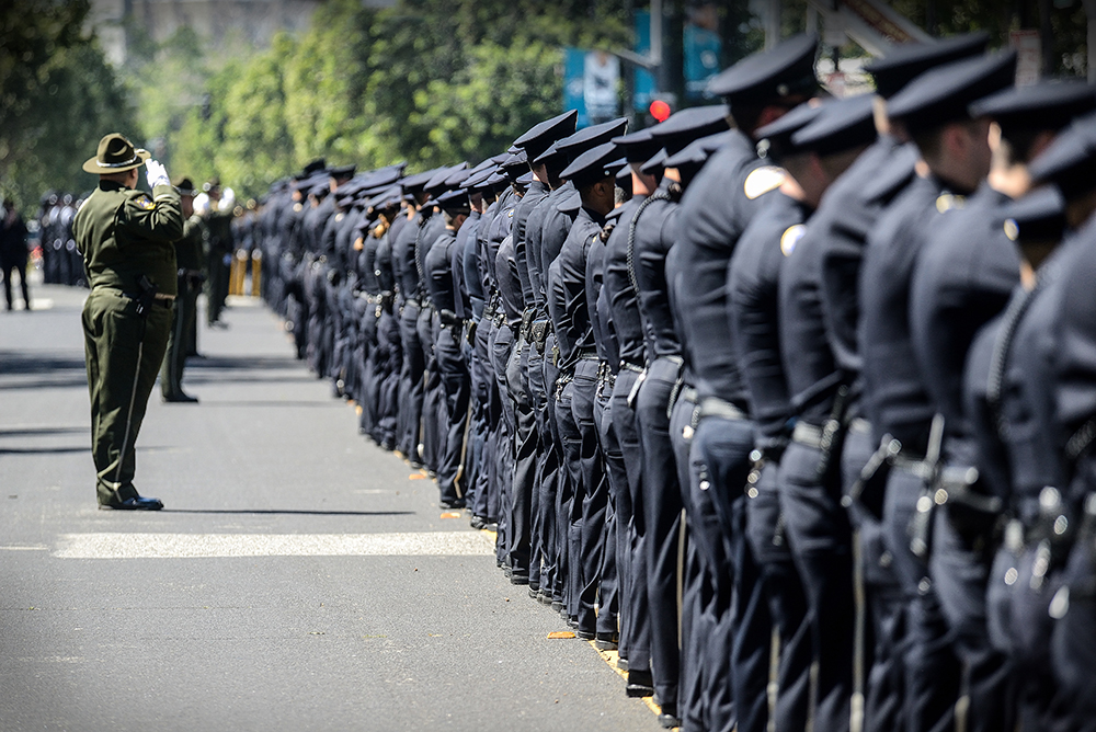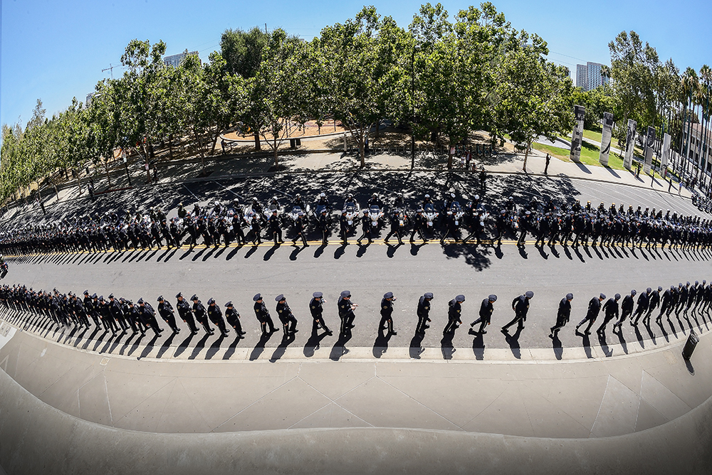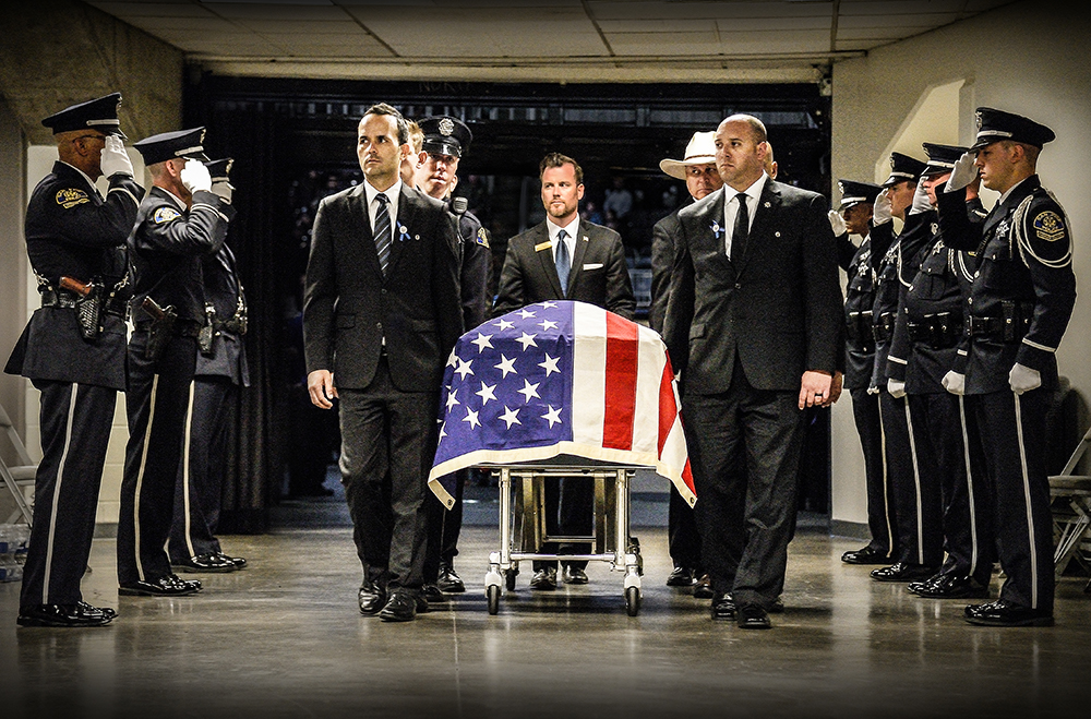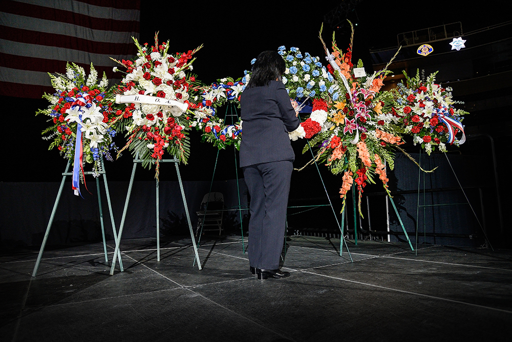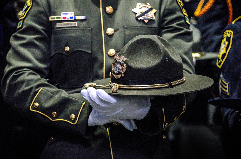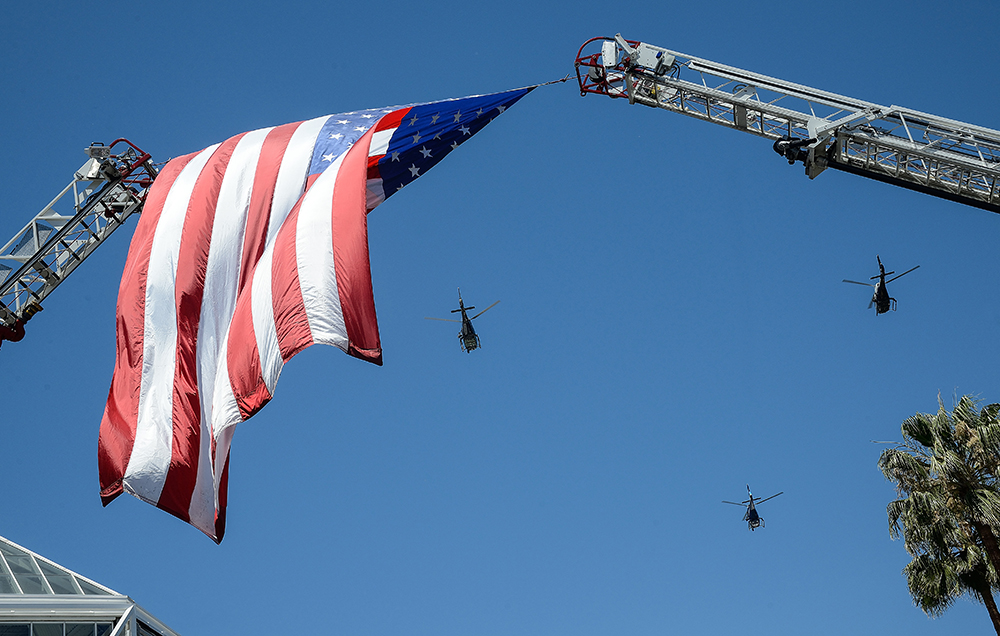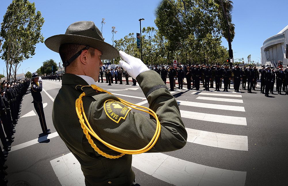 San Jose’s top cop also happens to be its most eloquent speaker. So on Tuesday, Chief Eddie Garcia eulogized Officer Michael Katherman, who became the city’s 13th line-of-duty casualty after a June 14 traffic collision. “Mike was an exceptional cop, but an even better man,” Garcia said. State Attorney General Kamala Harris joined hundreds of police officers from across the Bay Area at SAP Center to pay respects to Katherman—a motorcycle officer, 11-year department veteran, husband and father of two school-aged sons, Josh and Jason. Notably absent from the event, at the family’s behest, was most of the City Council and the mayor himself, Sam Liccardo. Councilman Ash Kalra attended the event with colleague Raul Peralez, who served alongside Katherman before getting voted onto the council. Spelled in blue-and-white flowers onstage and emblazoned on black bands worn by fellow officers was his badge number: 3900. A tearful Michael Whittington, who went from being Katherman’s academy-mate to beat partner before moving on to the county District Attorney’s Office, said his fallen friend was “built for power.” Kat Man, as his buddies called him, often surprised people. At just 5-foot-8, he could dunk a basketball. He jogged slow but sprinted fast. Kat Man hauling ass during the 100-yard dummy drag, Whittington quipped, was “like watching a bear carry a kitten.” Katherman, his smile “big as a grand piano,” entertained friends with impersonations of Chris Farley, Kermit the Frog and a retired SJPD sergeant. As a vice, he preferred ice cream over beer. When the chief looked through Katherman’s personnel file, two cases stood out. In one, a grandmother called his heart-to-heart talk with her wayward teen granddaughter “a life-changing event for the family.” In another, Christmas Eve 2011, he saved the life of a stabbing victim. “There is no such thing as routine patrol,” Garcia said before exhorting the auditorium to celebrate Katherman’s life as well as mourn the loss. “You raised an honorable, righteous and caring young man,” Garcia told the fallen officer’s parents, Tom and Diane Katherman. “Your mission is accomplished.”