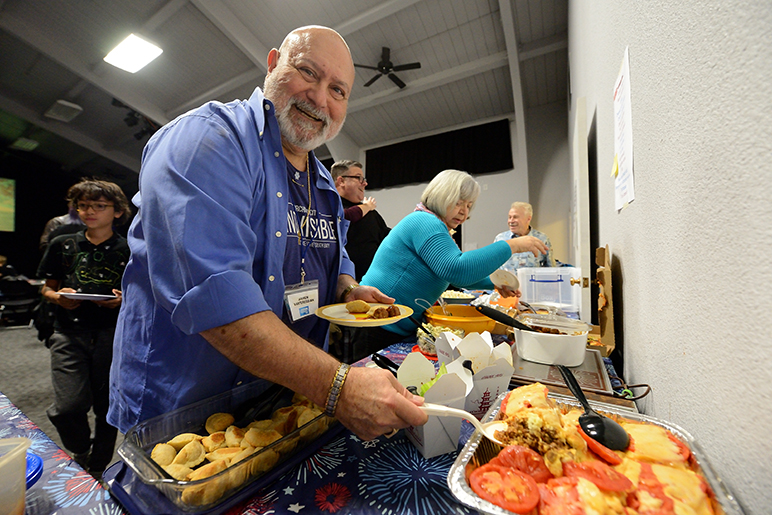 - OCI members feast on a potluck while watching the results trickle in on a screen behind them. (Photo by Greg Ramar)