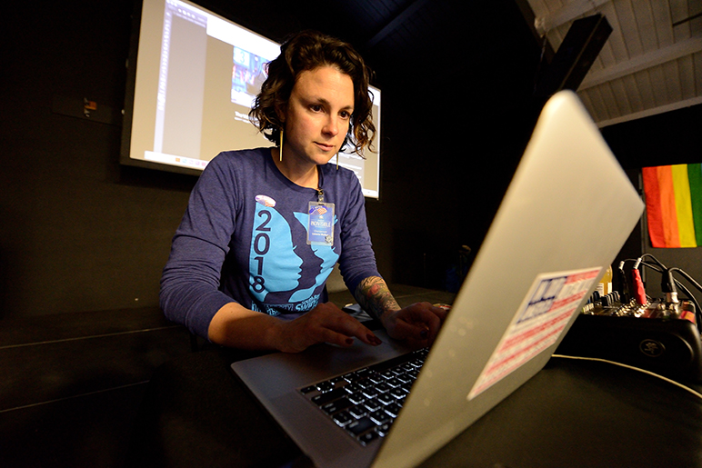 - Celeste Walker, one of OCI’s lead organizers, refreshes her laptop to catch the latest ballot tally. (Photo by Greg Ramar)