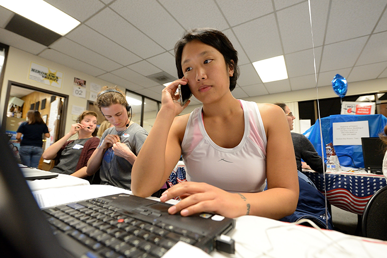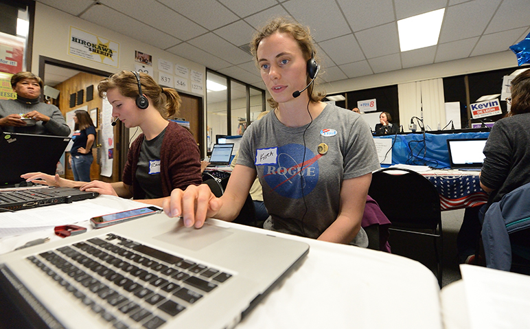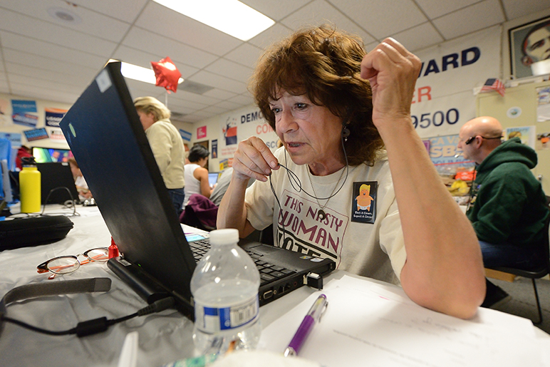 - A Democratic Party volunteer stationed at her computer Tuesday night. (Photo by Greg Ramar)